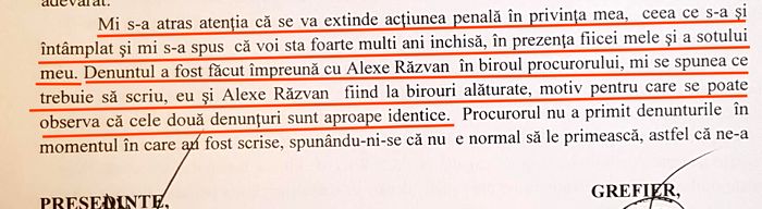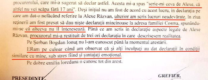 „Desi initial nu am fost de acord cu acest lucru, in declaratia pe care am dat-o (…) am scris lucruri neadevarate, in ziua retinerii am fost presat sa dau niste declaratii mincinoase la adresa familiei Cosma spunandu-mi-se ca altceva nu il intereseaza. Pana ce am scris in declaratie aspecte legate de Alexe Razvan, procurorul mi-a restituit de 3 ori declaratia in care descrisesem realitatea (…) eram pe culoar cand am observat ca si alti inculpati au dat declaratii in conditii similare cu mine, sub stres fiind si santajati emotional”.