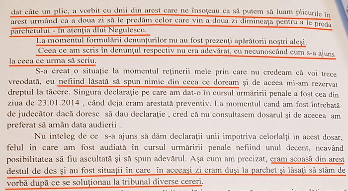 Am dat acea declaratie pentru ca am fost chemata impreuna cu Alexe Razvan de catre procurorul Negulescu. (…) Nu am solicitat audierea cu identitate protejata, iar la acest moment nu imi este teama de Alexe Razvan, Cosma Vlad si Usurelu Petrica, dar imi este frica de procurorul Negulescu. (…) Nu am dat aceasta declaratie din proprie initiativa in scopul de a incrimina pe cineva, ci probabil mi-a fost aratata o alta declaratie, dar nu stiu a carei persoane si mi-a fost sugerat de catre procurorul Negulescu sa declar in acest mod”.