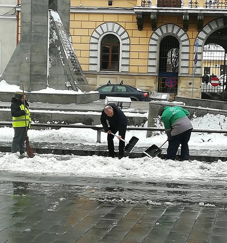 Pe Facebook, Fancsali Tamas a adăugat fortografii cu mesajul: Acum, uitându-mă afară pe geam de la lucru văd muncitori care curăţă trotuarul de zăpadă în Piaţa Unirii, printre ei muncind greu este un om care este un exemplu de primar, Dl. Emil Boc doamnelor şi domnilor!