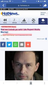 Un consultant britanic, Rupert Wolfe Murray, care în anul 2016 îşi desfăşura activitatea în România, a declarat că în luna august a acelui an a fost contactat de un responsabil al companiei de analize de date Cambridge Analytica în vederea unei posibile implicări în campania electorală a Partidului Social-Democrat (PSD), a relatat miercuri Associated Press (AP), preşedintele PSD, Liviu Dragnea precizând ulterior, într-o declaraţie acordată AP, că PSD nu a folosit serviciile acestei companii în campania electorală, informează portalul abcnews.go.com.