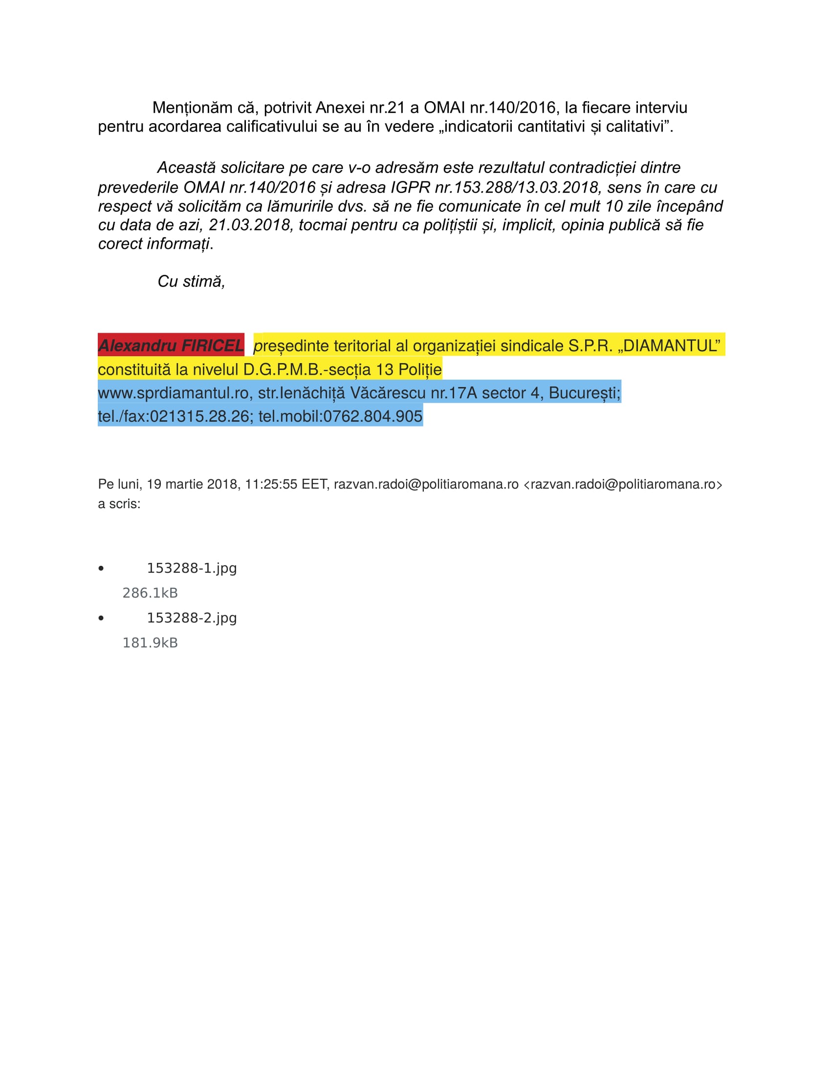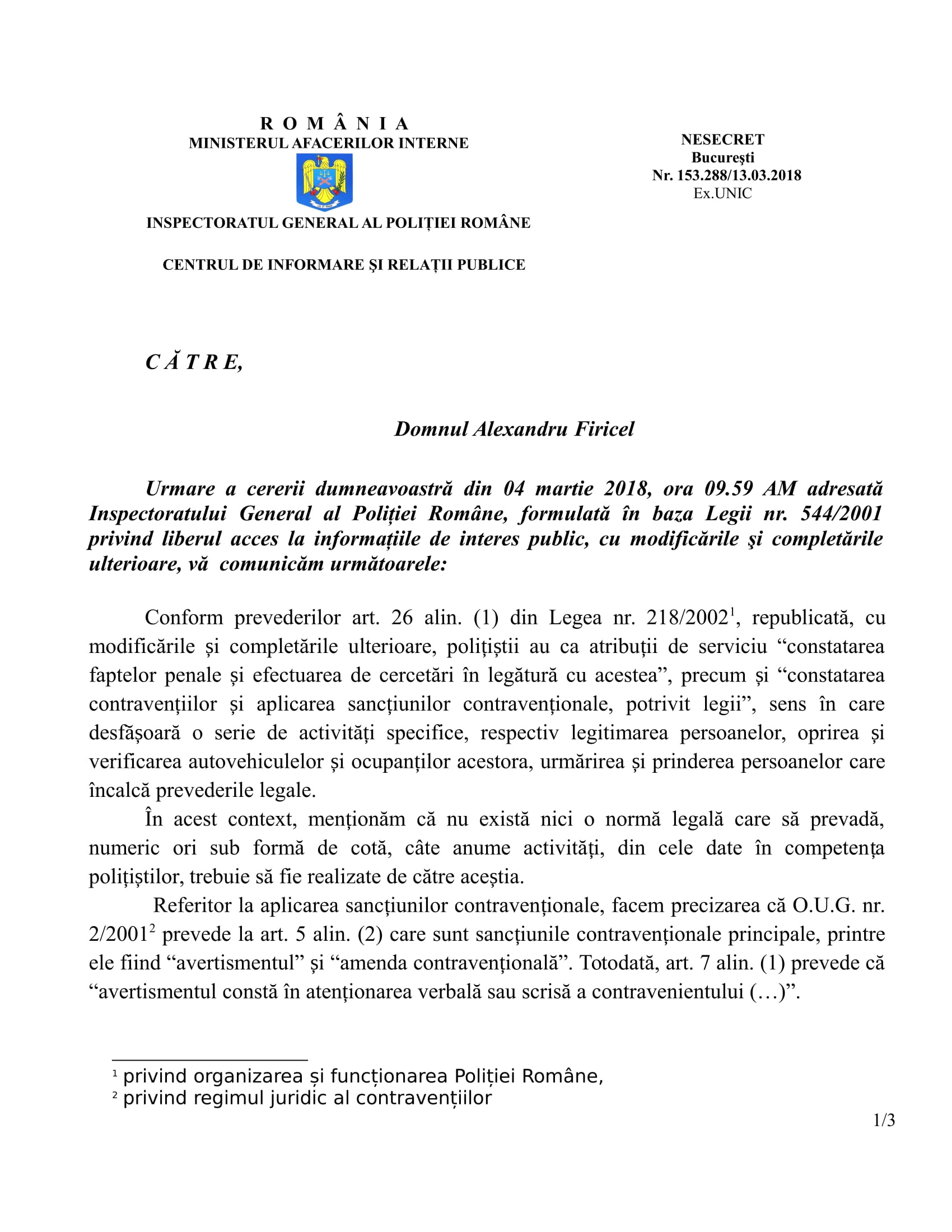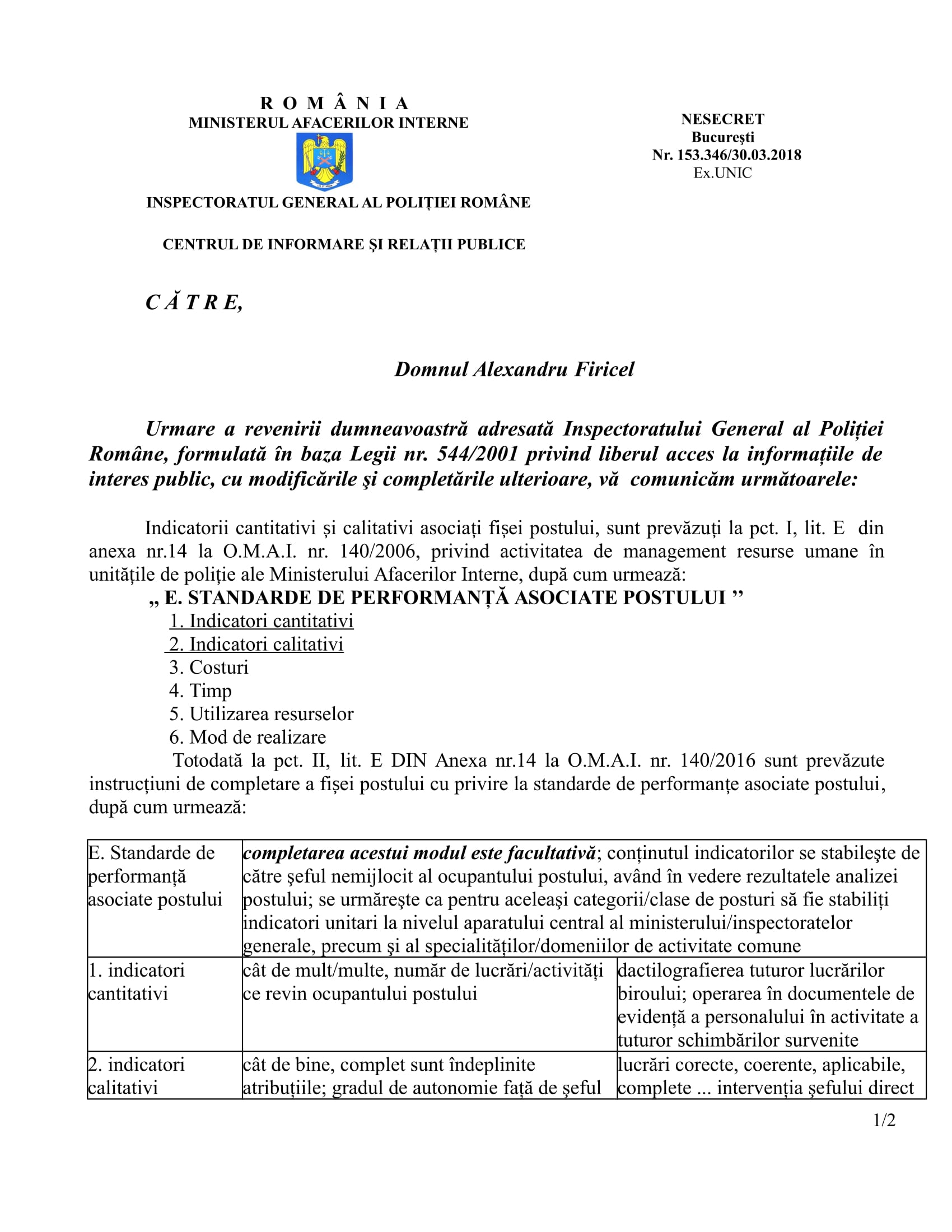 Interpelata institutia IGPR cu privire la „indicatorii cantitativi si calitativi” prevazuti in anexele OMAI 140/2016 ca motiv al sefilor de a premia/sanctiona politistii constatatori pentru nr. prea mic/mare de contraventii respectiv fabricarea/solutionarea de dosare penale, institutia a raspuns scurt si la obiect: nu pot fi invocati acesti indicatori pentru a justifica sanctionarea abuziva a persoanelor de catre politistii constatatori de abateri de la Lege.https://www.incisivdeprahova.ro/2018/03/14/exclusivi-g-p-r-se-dezice-de-toti-sefii-inculti-care-normeaza-munca-de-politie-prin-obligarea-agentilor-constatatori-aplica-contraventii/