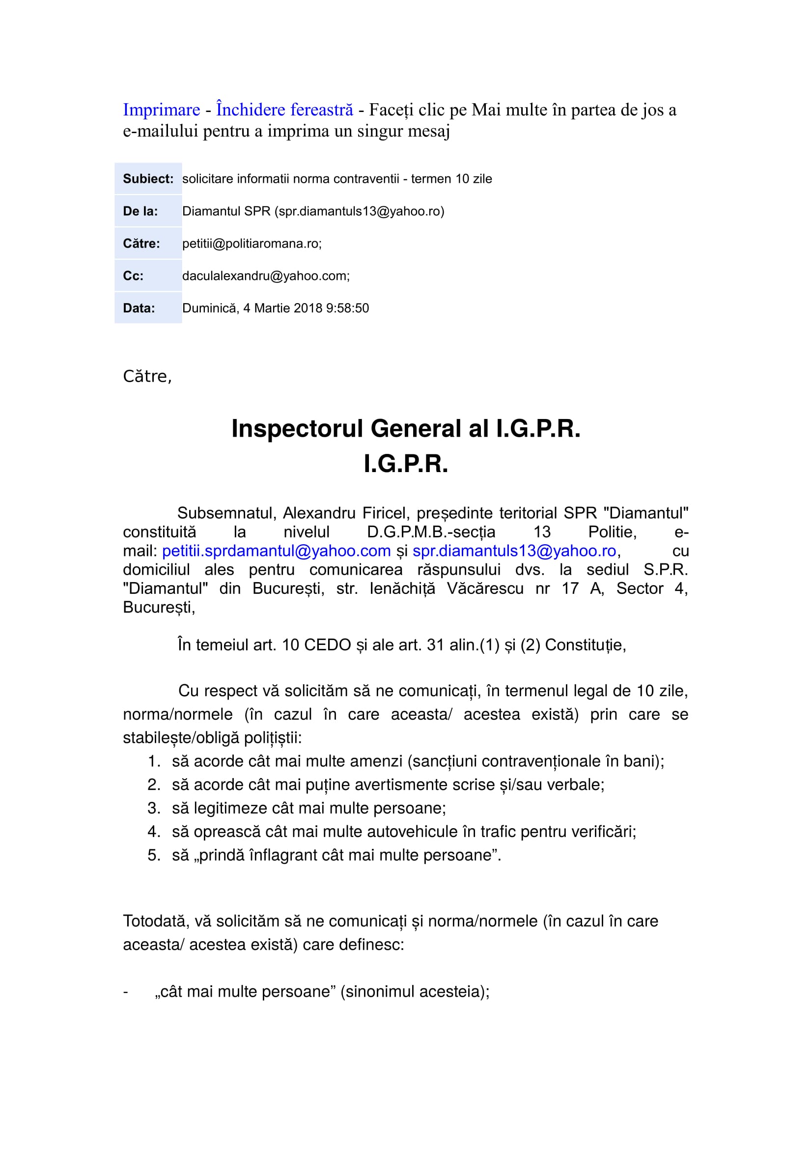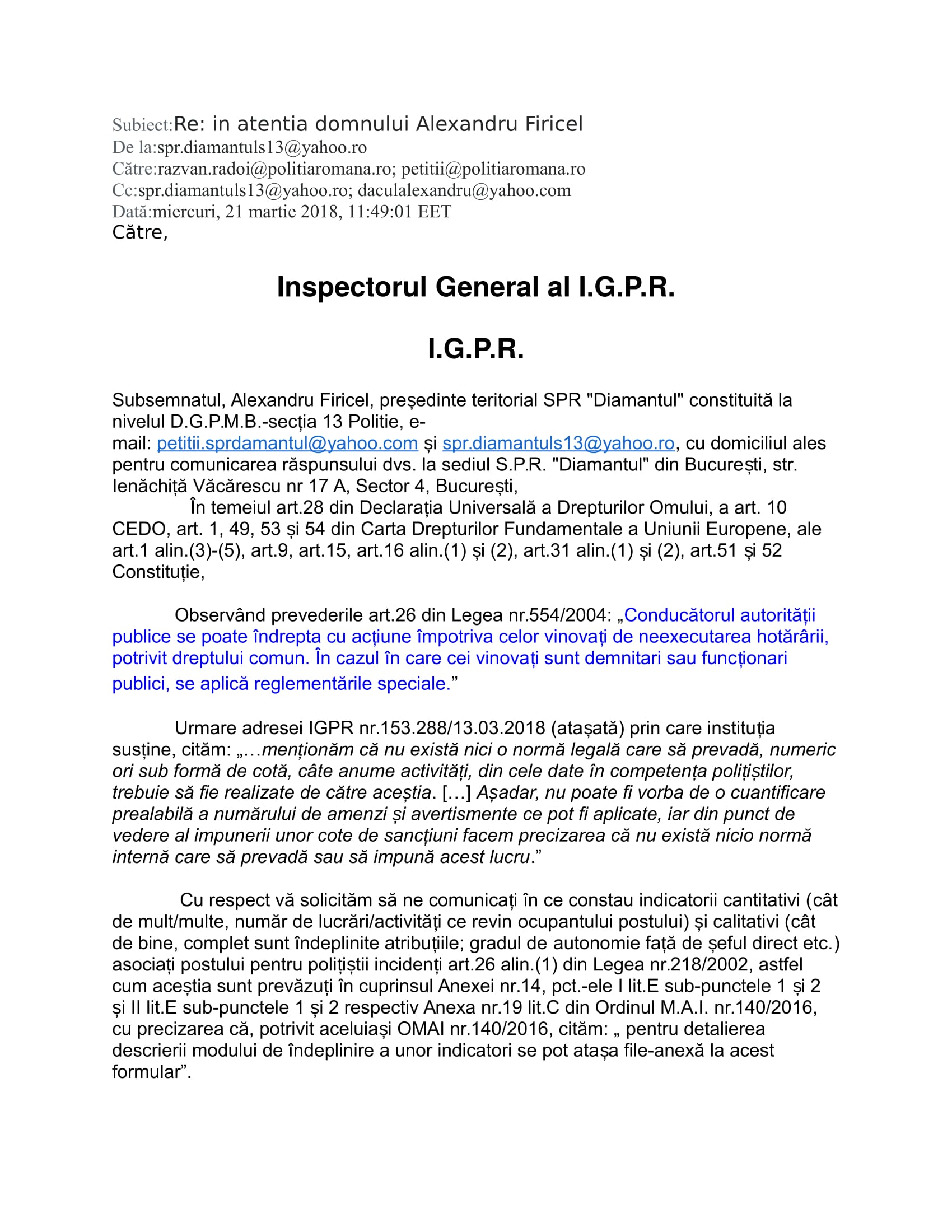 Daca la IPJ Cluj (sectia 1 Politie) conducatorii nu au habar de prevederile Legii nr.218/2002 privin Politia Romana, nu acelasi lucru se poate sustine in cazul IGPR.