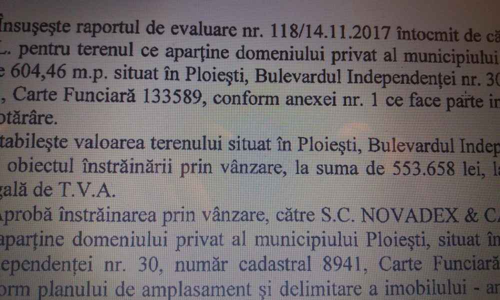 O Hotarare a Consiliului Local Ploiesti ne-a pus pe ganduri. Cu un evaluator de prin Craiova, Consiliul Local Ploiesti va vinde, la un prêt derizoriu (197 Euro/m.p),  604,46 m.p situat in Ploiesti, Bulevardul Independentei nr 39, firmei NOVADEX&CA SRL, conform Hotararii nr 89 din 29.03.2018. Ce interese se ascund in spatele acestei societati si cine este personajul din administratia locala aflat in spatele acestei actiuni va lasam pe dumneavoastra sa ghiciti pana la viitorul numar in care vom reveni si cu niscai’ aspecte penale privind si un off-shore ce apare in aceasta “increngatura” pe care poate o va sesiza si cei de la D.N.A –ST Ploiesti daca nu sunt prea “ocupati”.