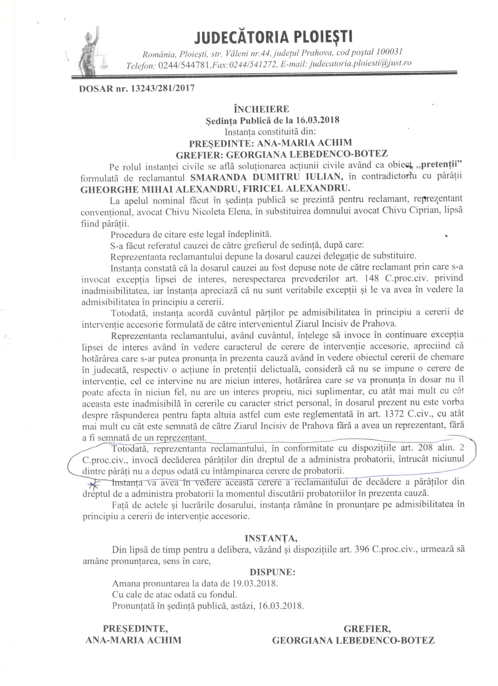 În goana-i după averi și pentru a-și justifica șpăgile pe care le ține, de frică, „sub cearceaf” respectiv pentru a-și „șterge” dosarele penale aflate pe rolul unităților de Parchet (credem noi), a fost inventat dosarul de la judecătoria Ploiești înregistrat sub nr.13243/281/2017 (dosar în care Incisiv de Prahova „și-a băgat nasul”).