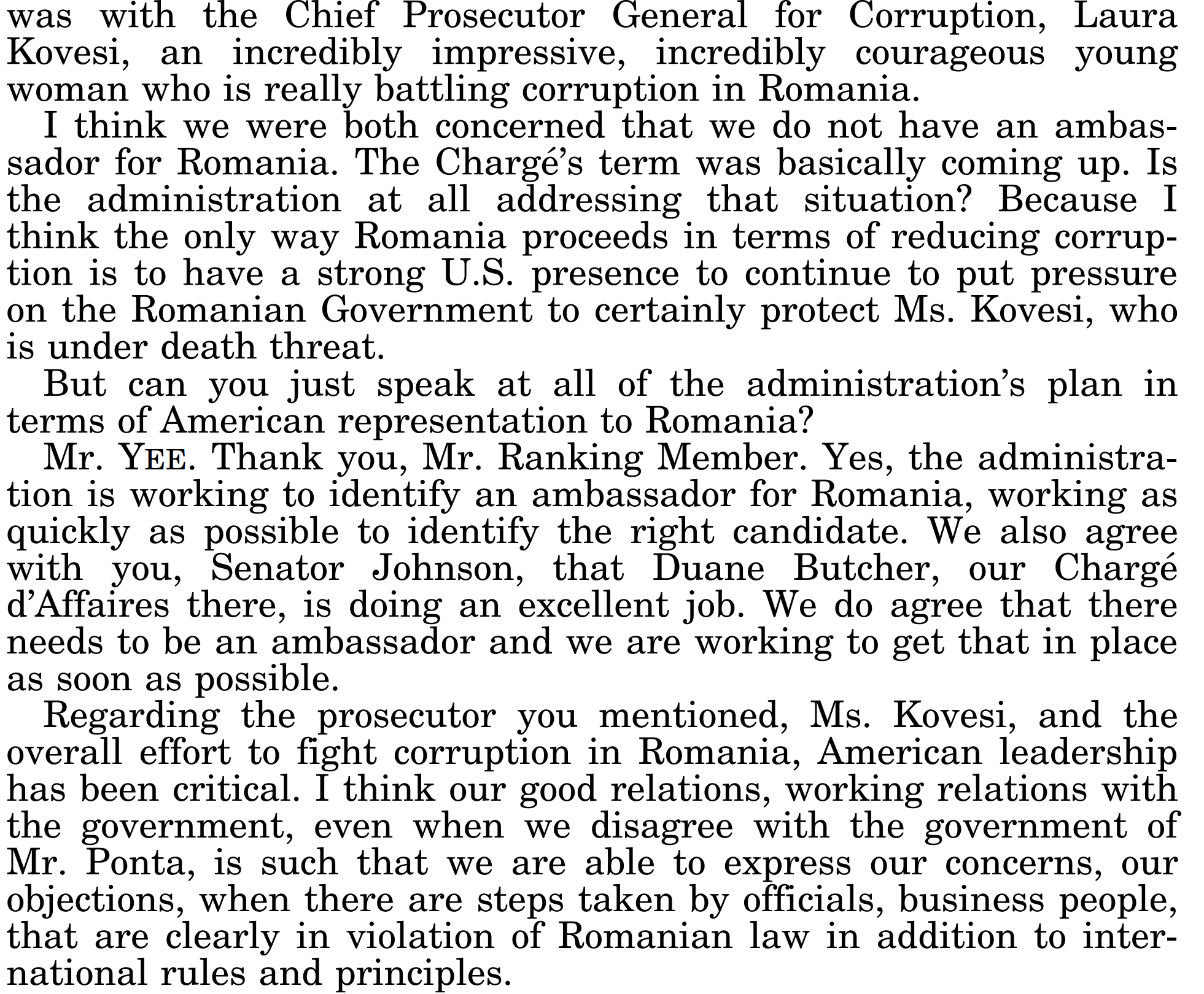 ”Cred că amândoi suntem îngrijorați că nu avem încă un ambasador în România. Mandatul însărcinatului cu afaceri se apropie, și el, de final. Este conștient Departamentul de stat de această situație? Pentru că eu cred că singurul mod în care România poate continua pe drumul spre reducerea corupției este să existe o prezență americană puternică care să pună presiune permanentă pe guvernul român pentru a garanta protejarea doamnei Kovesi, aflată în pericol de moarte”. (?!!)