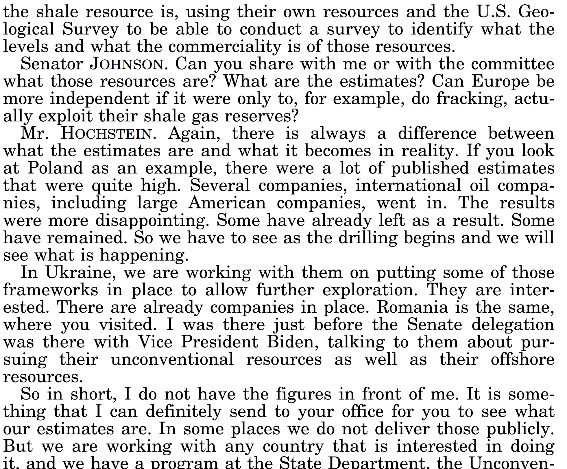 El a solicitat celor doi oficiali să-i transmită dacă administrația americană are date concrete despre rezervele de gaze de șist din țările est-europene, în lumina prospecțiunilor efectuate de mari companii petroliere, și dacă se poate începe curînd exploatarea acestora. Senatorul dorea să știe cifre și date concrete despre dimensiunea depozitelor descoperite în țări precum România, Polonia sau Ucraina și alte amănunte. Potrivit lui Hochstein, însă, un răspuns concret era imposibil, mai ales că estimări preliminare asupra unor zăcăminte fuseseră contrazise de cercetările mai aprofundate. El a vorbit și de companii americane care au forat în estul Europei, apoi au plecat.