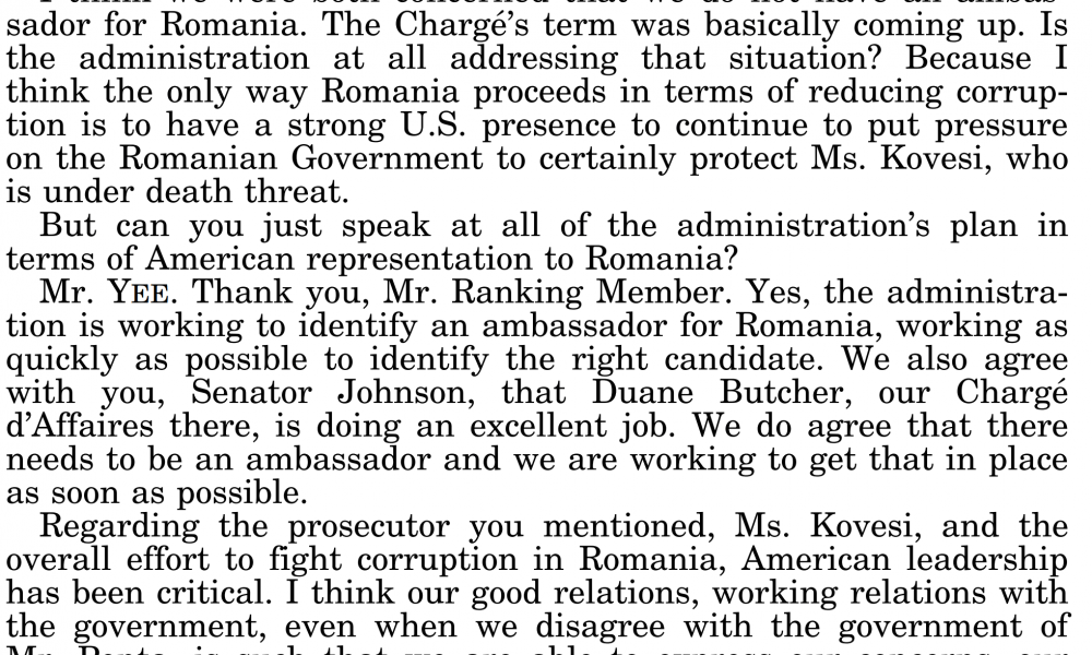 În răspunsul său, Yee a dat asigurări că DS se preocupă de identificarea unui nou ambasador, cu o nuanță destul de interesantă: ”În ceea ce privește procurorul pe care l-ați menționat, doamna Kovesi, și de efortul per ansamblu de combatere a corupției în România, administrația americană a fost critică”.
