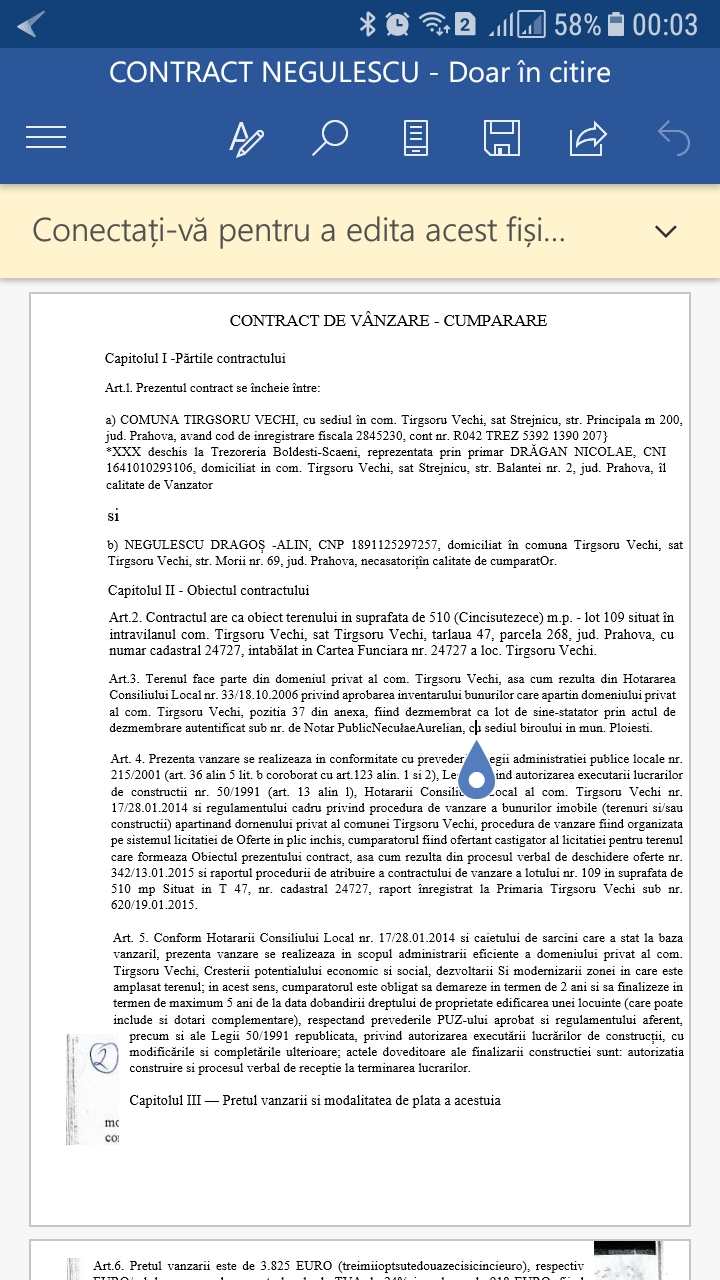 Pentru a se face dovada domiciliului în acea localitate, s-a încheiat un contract fictiv de locaţiune / închiriere locuinţă, între o proprietară de sex feminin, bătrână, cu handicap sever, nevăzătoare, şi numitul NEGULESCU DRAGOŞ ALIN. Proprietara-locator nu cunoaşte să-şi fi dat vreodată acordul ca numitul NEGULESCU DRAGOŞ să-şi stabilească domiciliul la ea în casă şi nici nu a semnat contractul de închiriere. Este posibil ca actul juridic să fie semnat, în locul titularei, de fiul acesteia, ŞTEFAN, fost ofiţer de poliţie, acum pensionat, aflat în relaţii de prietenie cu procurorul NEGULESCU MIRCEA, căruia, în timpul activităţii, îi înmâna „fişicuri cu bani”.