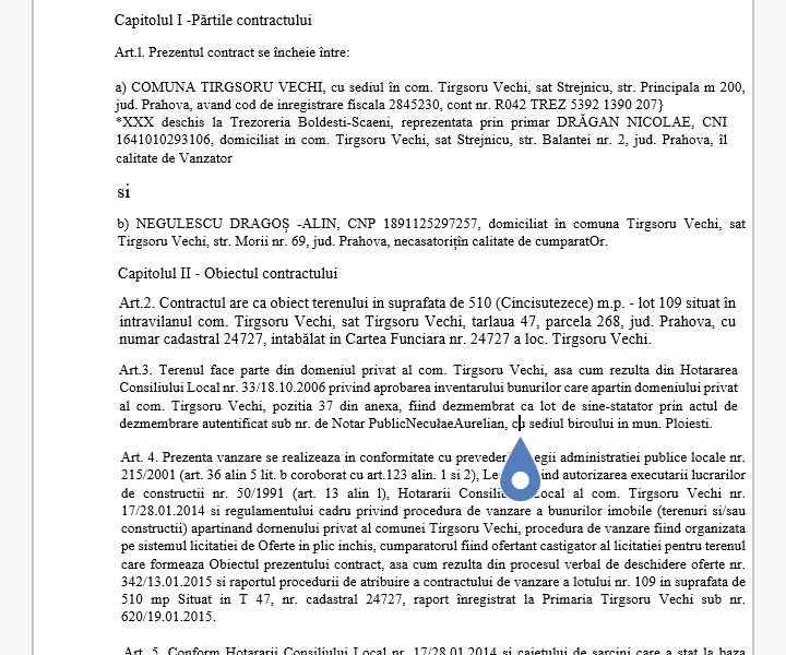 Pentru a se face dovada domiciliului în acea localitate, s-a încheiat un contract fictiv de locaţiune / închiriere locuinţă, între o proprietară de sex feminin, bătrână, cu handicap sever, nevăzătoare, şi numitul NEGULESCU DRAGOŞ ALIN. Proprietara-locator nu cunoaşte să-şi fi dat vreodată acordul ca numitul NEGULESCU DRAGOŞ să-şi stabilească domiciliul la ea în casă şi nici nu a semnat contractul de închiriere. Este posibil ca actul juridic să fie semnat, în locul titularei, de fiul acesteia, ŞTEFAN, fost ofiţer de poliţie, acum pensionat, aflat în relaţii de prietenie cu procurorul NEGULESCU MIRCEA, căruia, în timpul activităţii, îi înmâna „fişicuri cu bani”.