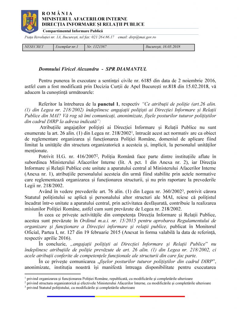 În concluzie, în baza adresei M.A.I. nr. 1321567/16.05.2018, am tras următoarea concluzie: în România lui 2018 Poliția NU EXISTĂ și România e o „țară polițistă”!