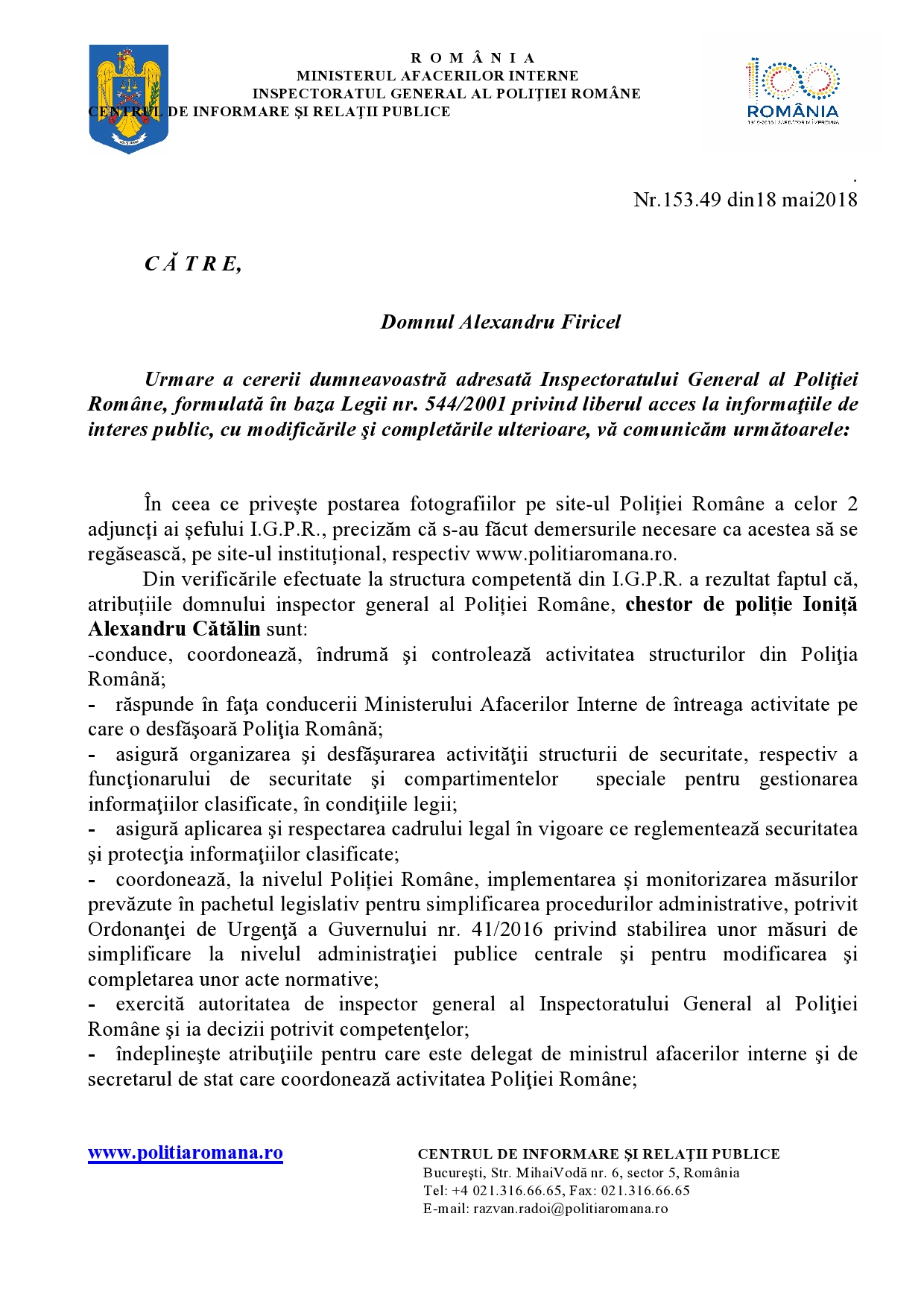 Prin adresa nr.153.49 din18 mai2018, IGPR-ul ne arată imixtiunea conducerii IGPR-ului nu doar în „dosarele sensibile” aflate pe rolul unităților de parchet și instanțelor de judecată ci, mai ales, că această „unitate centrală” a Poliției imixtionează, nepermis, în actul de Justiție (fila 2): „planifică activităţile proprii şi le coordonează pe cele specifice structurilor subordonate, intervenind cu completări şi măsuri suplimentare acolo unde se impune” (este doar un exemplu evidențiat în adresa de maisus).