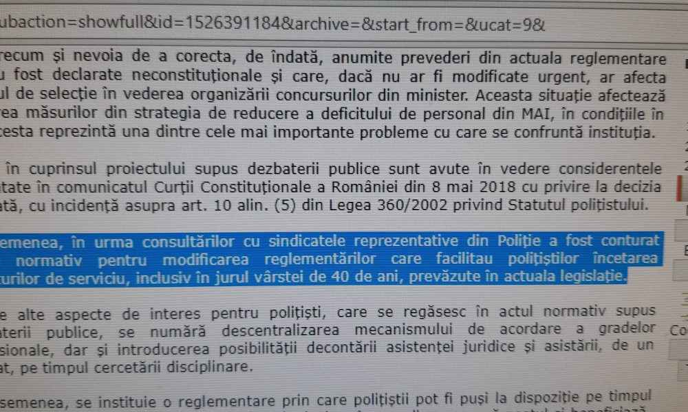 În data de 15 mai 2018, M.A.I. posta pompos pe sitte-ul instituției comunicatul referitor la modificarea statutului polițistului propusă de instituție prin ordonanță de urgență (cu încălcarea art. 73, 115 alin.(6),130 și 131 Constituție) susținându-se în acest comunicat, cităm: „De asemenea, în urma consultărilor cu sindicatele reprezentative din Poliție a fost conturat cadrul normativ pentru modificarea reglementărilor care facilitau polițiștilor încetarea raporturilor de serviciu, inclusiv în jurul vârstei de 40 de ani, prevăzute în actuala legislație.”