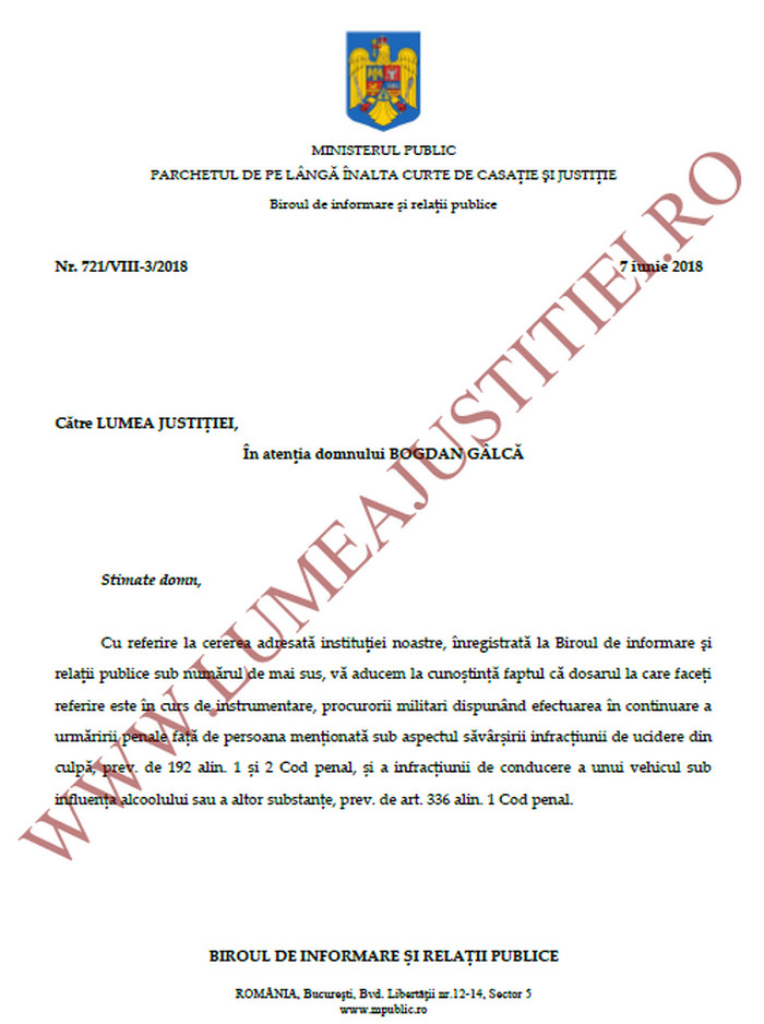 “Dosarul este in curs de instrumentare, procurorii militari dispunand efectuarea in continuare a urmaririi penale fata de persoana mentionata sub aspectul savarsirii infractiunii de ucidere din culpa, prev. de 192 alin. 1 si 2 Cod penal, si a infractiunii de conducere a unui vehicul sub influenta alcoolului sau a altor substante, prev. de art. 336 alin. 1 Cod penal”.