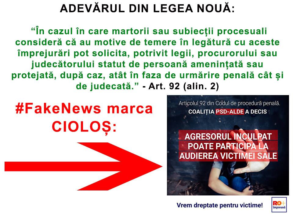 Făcând referire la modificarea articolului 92, alin. 2 din Codul de procedură penală, distinsul Cioloș vrea să genereze #EMOȚIE și scrie așa pe Facebook: „Agresorul inculpat poate participa la audierea victimei sale”. #FALS! În realitate, în alineatul modificat mai apare și următorul text, pe care Cioloș se face că nu îl vede inducându-și publicul în eroare: „În cazul în care martorii sau subiecții procesuali consideră că au motive de temere în legătură cu aceste împrejurări pot solicita, potrivit legii, procurorului sau judecătorului statut de persoană amenințată sau protejată, după caz, atât în faza de urmărire penală cât și de judecată”.
