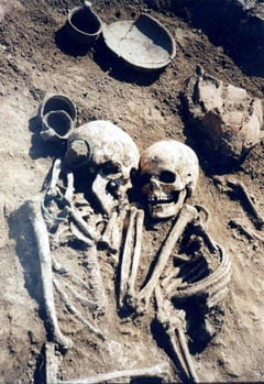 Arheologii au scos la lumina, dupa 3.000 de ani, ramasitele a doua persoane, un barbat si o femeie, inlantuite intr-o imbratisare care a sfidat timpul. Analiza scheletelor a aratat ca barbatul a murit primul si, cel mai probabil, femeia, despre care se banuieste ca ii era sotie, a vrut sa fie ingropata de vie alaturi de el.