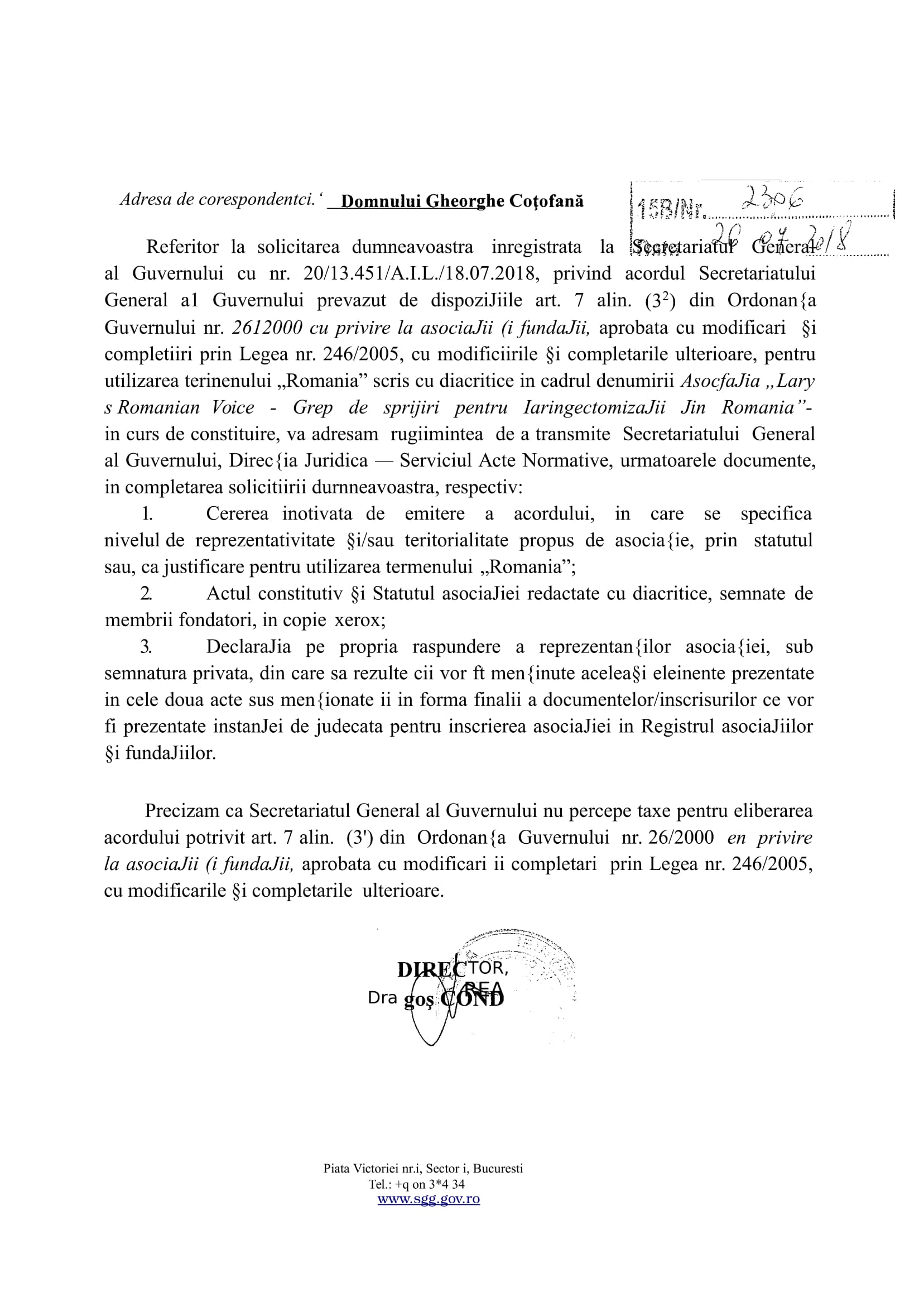 În fapt, domnul prof. univ. dr. Gheorghe Coțofană a solicitat un acord prealabil al acestei administrații a Guvernului, conform art.7 alin. 3^2[1] din OG nr.26/2000 tocmai pentru a înființa o asociație care, odată înființată, ar putea sprijini persoanele care au suferit mutilanta operație de laringectomie totală, în urma unui cancer laringian. Doar că birocrați inculți, necunoscători ai Legii (dreptului) din Secretariatul General al Guvernului au întocmit proiectul adresei semnate cu mult-prea multă ușurință(dezinteres) de directorul Condrea… mai exact, funcționărime a SGG-ului cu creierele înghețate de la aerul condiționat din birouri ori prea obosite de vacanțele luxoase în care or fi consumat produse interzise/alcool s-au gândit că dacă solicită petentului să îndeplinească condiții neimpuse de Lege, vor evidenția cât de deștepți sunt. Fals!