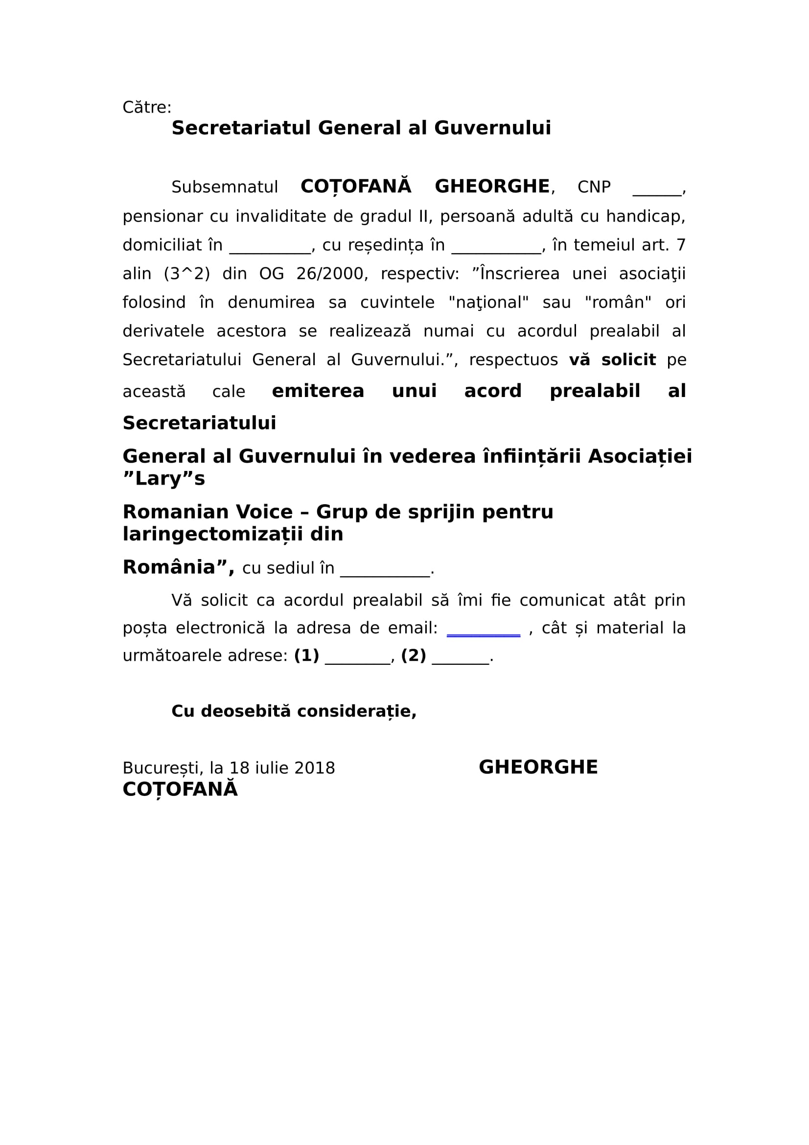 Am rămas uimit la primirea e-mailului domnului prof. univ.dr. Gheorghe Coțofană referitor la disprețul față de Lege și dorința unui om de a înființa o Asociație care să se ocupe îndeaproape de laringectomizații (bolnavii de cancer laringian care au suferit o operație de laringectomie totală) din „statul de drept” România manifestat de Secretariatul General al Guvernului prin directorul Condrea Dragoș.