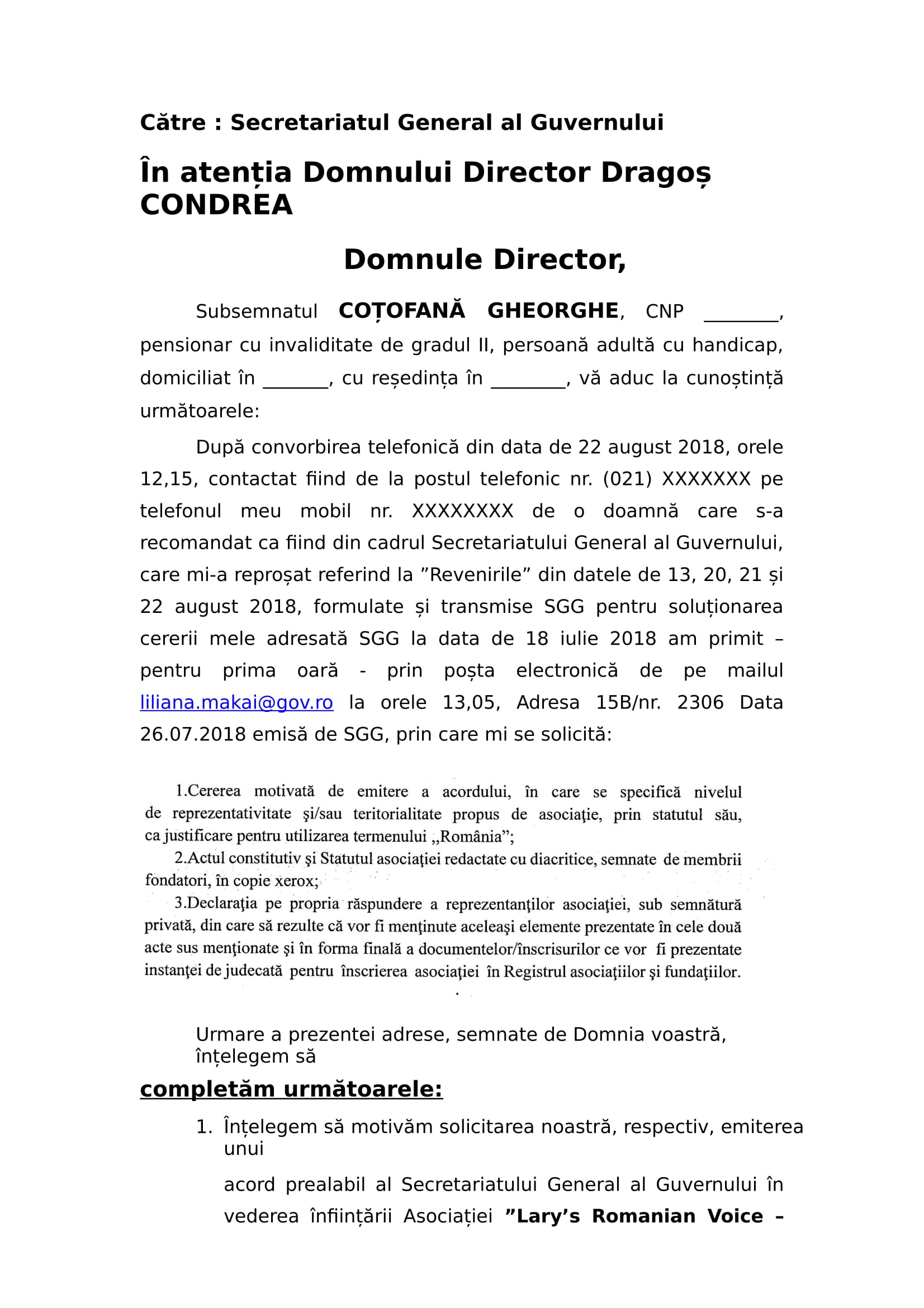 În fapt, domnul prof. univ. dr. Gheorghe Coțofană a solicitat un acord prealabil al acestei administrații a Guvernului, conform art.7 alin. 3^2[1] din OG nr.26/2000 tocmai pentru a înființa o asociație care, odată înființată, ar putea sprijini persoanele care au suferit mutilanta operație de laringectomie totală, în urma unui cancer laringian. Doar că birocrați inculți, necunoscători ai Legii (dreptului) din Secretariatul General al Guvernului au întocmit proiectul adresei semnate cu mult-prea multă ușurință(dezinteres) de directorul Condrea… mai exact, funcționărime a SGG-ului cu creierele înghețate de la aerul condiționat din birouri ori prea obosite de vacanțele luxoase în care or fi consumat produse interzise/alcool s-au gândit că dacă solicită petentului să îndeplinească condiții neimpuse de Lege, vor evidenția cât de deștepți sunt. Fals!
