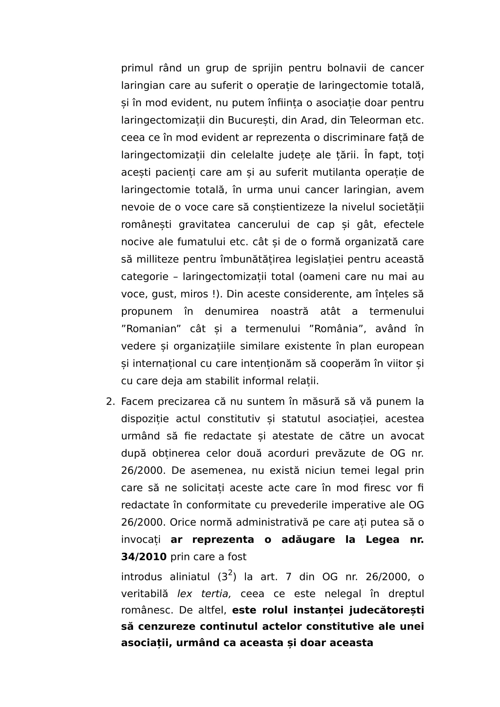 ”Facem precizarea că nu suntem în măsură să vă punem la dispoziție actul constitutiv și statutul asociației, acestea urmând să fie redactate și atestate de către un avocat după obținerea celor două acorduri prevăzute de OG nr. 26/2000. De asemenea, nu există niciun temei legal prin care să ne solicitați aceste acte care în mod firesc vor fi redactate în conformitate cu prevederile imperative ale OG 26/2000. Orice normă administrativă pe care ați putea să o invocați ar reprezenta o adăugare la Legea nr. 34/2010 prin care a fost introdus aliniatul (32) la art. 7 din OG nr. 26/2000, o veritabilă lex tertia, ceea ce este nelegal în dreptul românesc. De altfel, este rolul instanței judecătorești să cenzureze continutul actelor constitutive ale unei asociații, urmând ca aceasta și doar aceasta – instanța judecătorească, să dispună în numele Legii admiterea sau respingerea înființării unei asociații. Toate datele vor ajunge oricum în posesia Guvernului prin Ministerul Justiției care ține Registrul Național al asociațiilor și fundațiilor. Mai mult, în procedura judecătorească de autorizare a înființării unei asociații interesele Statului cât și ale Guvernului sunt apărate, la ședință fiind obligatorie prezența unui procuror din cadrul Ministerului Public, aflat sub autoritatea Ministrului Justiției – membru al Guvernului României.”