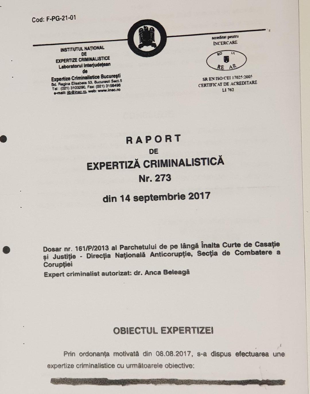 În toamna anului trecut, Institutul Național de Expertize Criminalistice a făcut public „Raportul de expertiză criminalistică nr. 273 din 14 septembrie 2017“, o expertiză cerută în Dosarul nr. 161/P/2013, aflat în lucru la Direcția Națională Anticorupție de pe lângă Înalta Curte de Casație și Justiție.