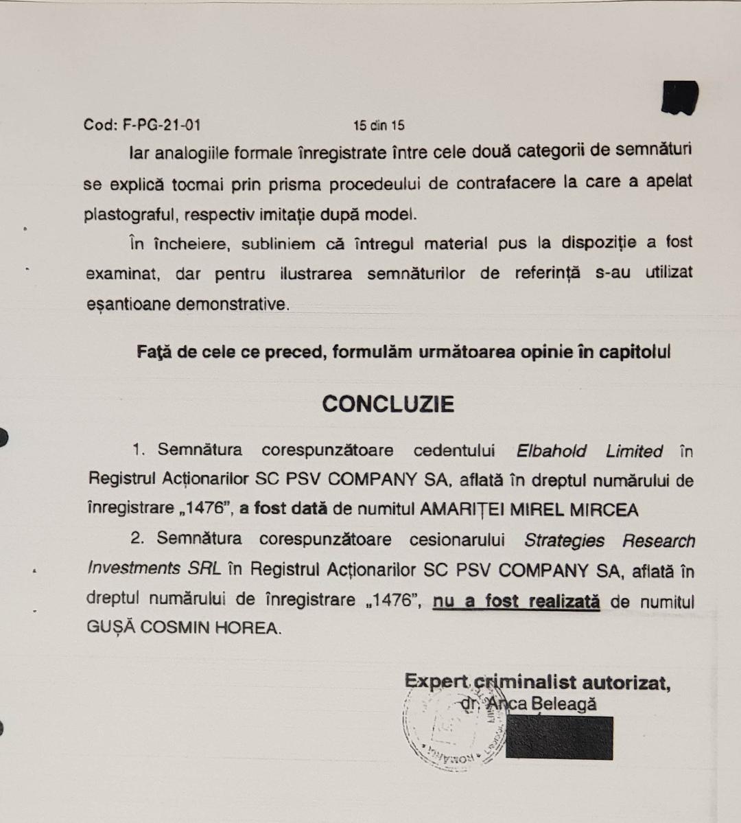 „1. Semnătura corespunzătoare cedentului Elbahold Limited în Registrul acționarilor SC PSV Company SA, aflată în dreptul numărului de înregistrare 1476, a fost dată de numitul Amariței Mirel Mircea.