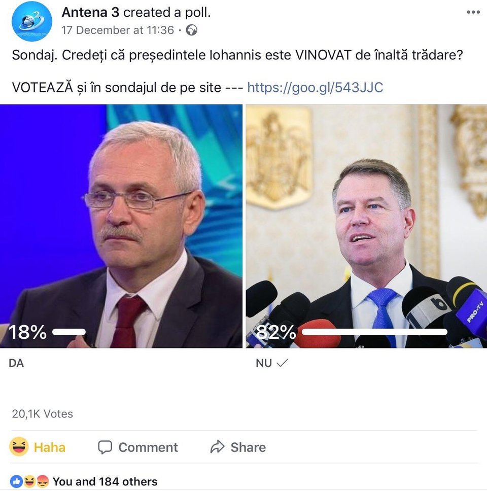 Mai mult de  80% dintre cei care au votat pe Facebook considera ca presedintele Iohannis nu trebuie sa fie pus sub acuzare pentru inalta tradare, asa cum doreste Liviu Dragnea.