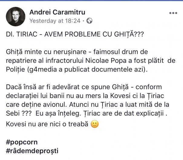 Dacă însă ar fi adevărat ce spune Ghiţă – conform declaraţiei lui banii nu au mers la Kovesi ci la Țiriac care deţine avionul. Atunci nu Țiriac a luat mită de la Sebi ??? Eu aşa înţeleg. Țiriac are de dat explicaţii . Kovesi nu are nici o treabă”, a scris Andrei Caramitru pe Facebook.