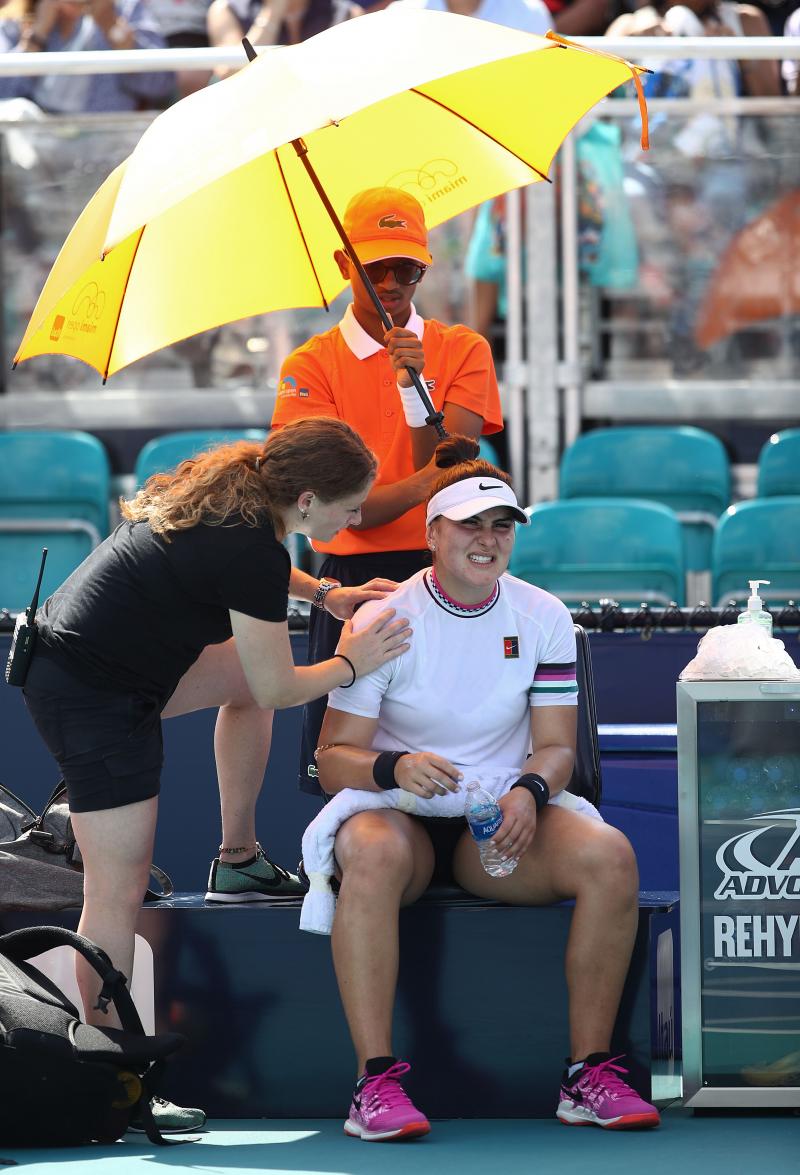 Bianca Andreescu părăsește turneul de la Miami 2019. Ea a abandonat din cauza unei accidentări în optimile de finală, când juca cu estona Anett Konteveit ©Foto: Guliver/GettyImages