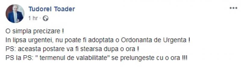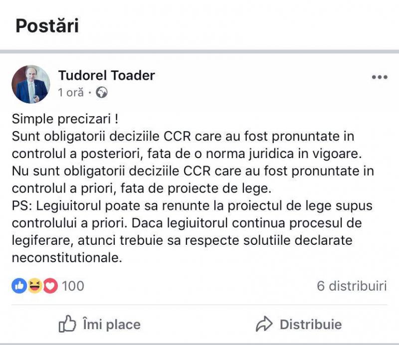 Într-o primă postare, ştearsă ulterior, Tudorel Toader explică faptul că sunt obligatorii deciziile CCR pronunţate cu privire la legile şi ordonanţele în vigoare (controlul a posteriori), nu şi cele pronunţate având ca obiect legile adoptate de Parlament înainte de promulgarea acestora (a priori).