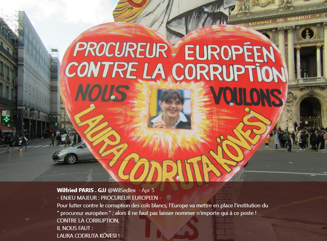 „Pentru a lupta împotriva corupției gulerelor albe, Europa va înființa instituția „procurorului european”: așa că nu lăsa pe oricine să fie numit în această funcție! Împotriva corupției, avem nevoie: Laura Codruța Kovesi”,se arată o postare pe pagina de Twitter a Vestelor Galbene din Justiție, potrivit hotnews.ro.