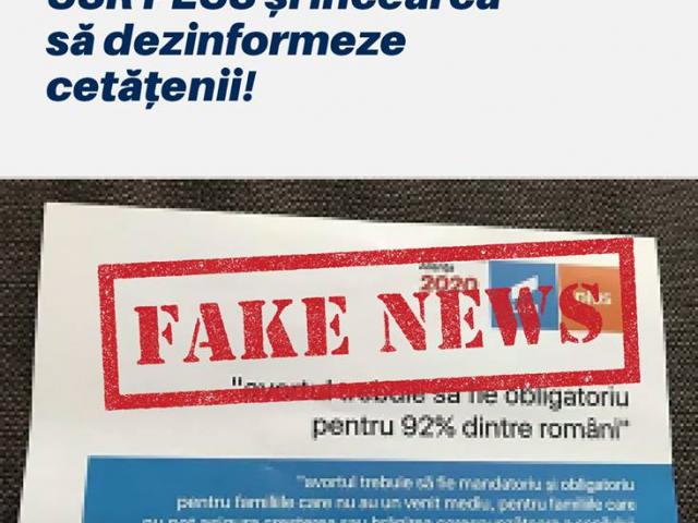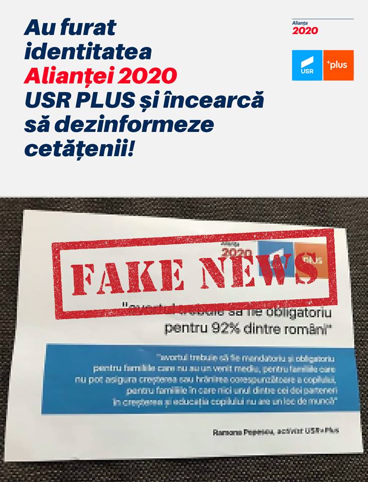 Alianţa 2020  USR PLUS susţine că este ţinta unei campanii de dezinformare prin pliante primite de oameni în cutiile poştale. În acele pliante se atribuie alianţei susţinerea ca avortul să fie obligatoriu în România. Alianţa anunţă că va face plângere penală şi cere poliţiei să afle cine este în spatele acestei campanii.