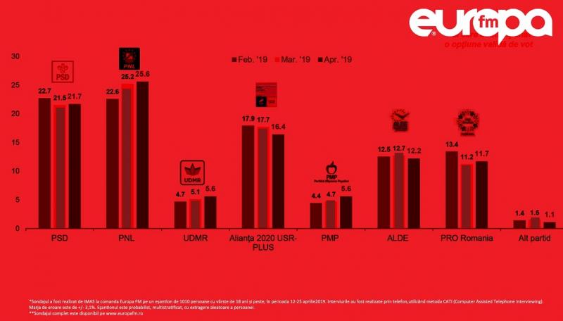 PNL a depășit pentru a doua oară la rând PSD în preferințele de vot ale românilor, arată un sondaj IMAS efectuat în luna aprilie la comanda Europa FM. Barometrul Europa arată 25,6% dintre opțiunile de vot pentru PNL, PSD are 21,7%, iar pe locul al treilea se clasează Alianţa 2020, formată din USR şi PLUS, cu 16,4% – într-o scădere cu mai mult de un procent faţă de luna martie.