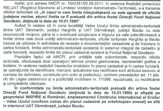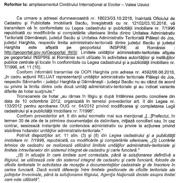 ”Consider că este foarte important de precizat că începând cu anul 2008, Prefectura Bacău, Oficiul de Cadastru și Consiliul Județean Bacău și Prefectura Harghita Oficiul de Cadastru și Consiliul Județean Harghita au început un proces de grănițuire între cele două județe, fără a ajunge însă la un consens – au vrut să stabilească printr-un proces verbal granița între județe, pentru că erau în litigiu pe acel tronson. După parcurgerea de către ambele Prefecturi a unor etape de consiliere între părți, conform legii, în 2012 tot nu s-a ajuns la niciun fel de acord. Totuși, în astfel de cazuri, legea spune că până la soluționarea litigiului, se utilizează limitele care se găsesc Geoportalul INSPIRE al României la 10 ianuarie 1990. Cunoscând această situație, am făcut o adresă la Oficiul de Cadastru și Publicitate Imobiliară Bacău și am cerut să mi se spună unde se află Cimitirul Internațional al Eroilor de la Valea Uzului. Am primit răspuns și amplasamentul Cimitirului Internațional al Eroilor de la Valea Uzului se află în interiorul orașului Dărmănești, județul Bacău.”