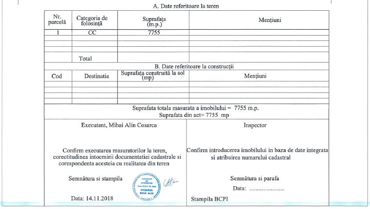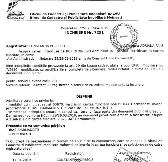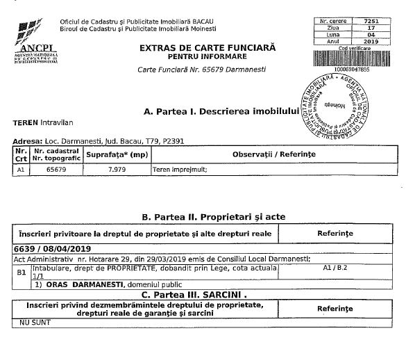 Oficiul de Cadastru și Publicitate Imobiliară Bacău, din data de 04.10.2018: