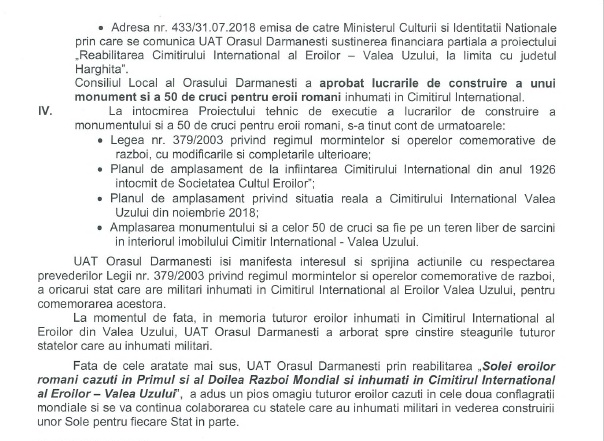 ”Crucile sunt dedicate eroilor români necunoscuți, iar monumentul ridicat acolo este dedicat tuturor eroilor înmormântați acolo: români, maghiari, nemți, etc. Am vrut să scoatem în evidență caracterul de cimitir internațional, iar pentru aceasta, în parcela românilor, am montat opt catarge pe care am arborat steagul Uniunii Europene și a celor șapte state care au eroii îngropați acolo” – a menționat primarul Constantin Toma, care a mai adăugat: ”Noi n-am profanat și nu ne-am atins nici de-un fir de iarbă. Cimitirul are are aproape 8.000 de mp și noi am lucrat pe 300 de mp, deci pe mai puțin de 4%. Am dat statutul de cimitir internațional și ne propunem în continuare să purtăm discuții cu ambasadele țărilor care au înhumați eroi acolo, și dorim să invităm aceste ambasade să vină, în funcție de cum preferă, să reabilităm solele eroilor lor. În baza Legii nr.379, eu ca administrator de cimitir sunt obligat să întrețin, să evidențiez detaliat mormintele și operele comemorative de război  – bineînțeles, din fonduri locale – și să am o relație de bună vecinătate și înțelegere cu toți cei care au eroi înmormântați acolo. ”