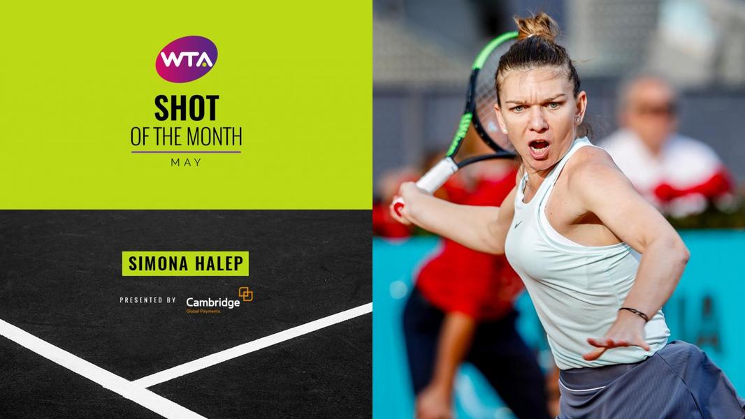 Simona Halep a câștigat titlul pentru lovitura lunii mai în circuitul profesionist feminin, potrivit site-ului WTA. Românca a candidat cu un passing reușit la turneul de la Madrid, în partida din turul al doilea cu britanica Johanna Konta.