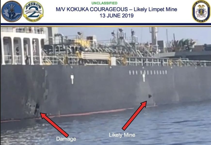 Oficialii americani spun că este vorba de o navă de patrulare a Gărzilor Revoluționare Iraniene ce s-a apropiat de petrolier după ce acesta a fost atacat, iar obiectul luat este o mină magnetică neexplodată.