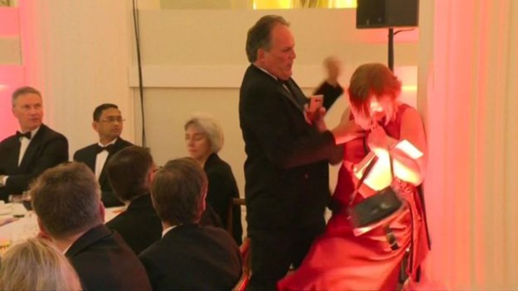Incidentul a avut loc joi seara, după ce activiști ecologiști au întrerupt discursul anual susținut de Philip Hammond despre starea economiei. Zeci de activiști îmbrăcați în roșu au pătruns cu forța în sala de festivități și au refuzat să plece.