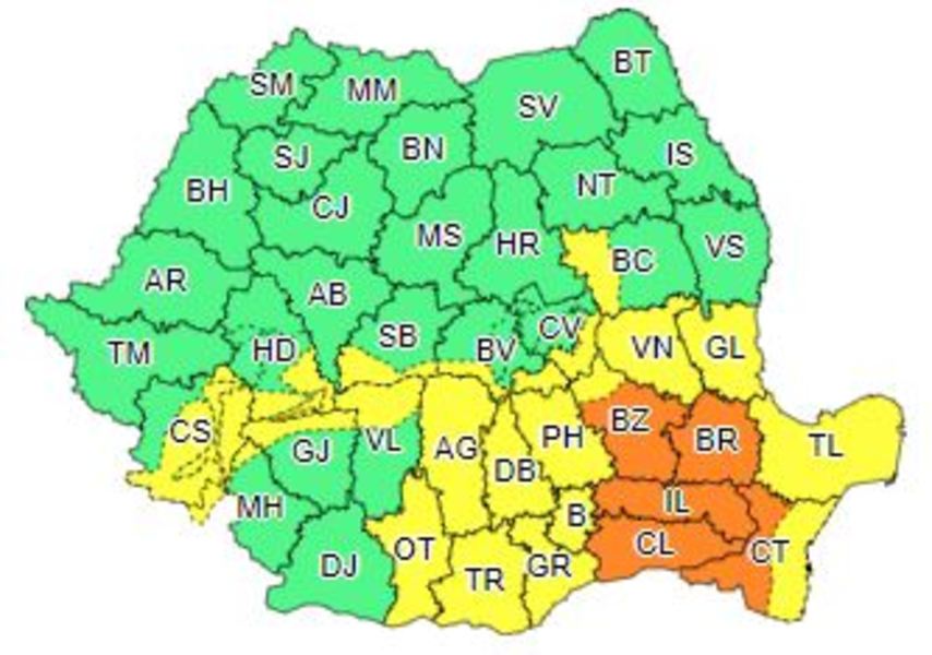 Potrivit codului portocaliu, începând cu ora 13.00, în județele Buzău, Brăila, Ialomița și Călărași, precum și în zona continentală a județului Constanța vor fi perioade cu intensificări ale vântului cu viteze la rafală, în general, de 80…90 km/h, vijelii, averse torențiale, frecvente descărcări electrice și căderi de grindină.