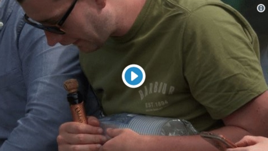 Pe lângă spectacolul oferit de sportivi pe teren, spectatorii de la Wimbledon se pot bucura în complexul londonez de mâncare bună și de băuturi rafinate. Unul dintre spectatori se poate considera norocos, dopul unei sticle de șampanie trecând atât de aproape de fața acestuia.