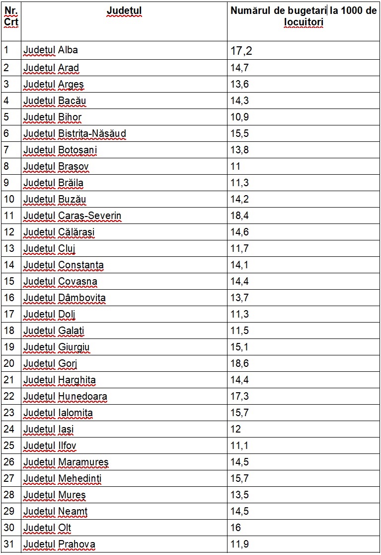 Pe baza datelor furnizate de Finanțe, ne-am uitat să vedem câți bugetari din adminsitrația publică locală sunt la mia de locuitori pe fiecare județ în parte.