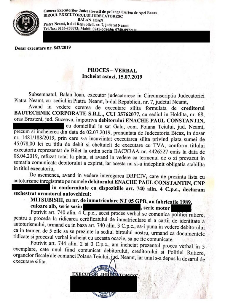 Poliția Poiana Teiului trebuie să ridice actele și să sechestreze 10 autovehicule în baza unei decizii judecătorești definitive și irevocabile contra debitorului Enache Paul Constantin, viceprimar al comunei Poiana Teiului. Faptul că șeful de post de la Poiana Teiului este rudă cu cel căruia trebuie să i se ia actele mașinilor nu are nicio relevanță în acest caz.