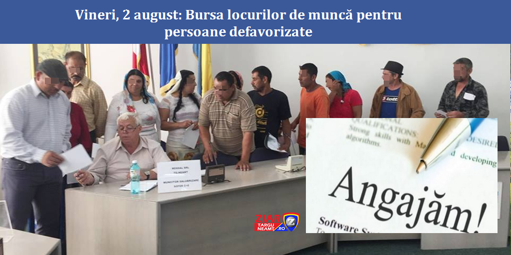 Vineri, 2 august, în Târgu Neamț are loc Bursa locurilor de muncă pentru persoanele defavorizate (beneficiare de ajutor social, persoane de etnie romă, etc)