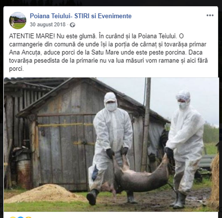 Primul exemplu este o postare menită să bage panică în oamenii din Poiana Teiului, anunțând o problemă de sănătate publică și veterinară falsă.