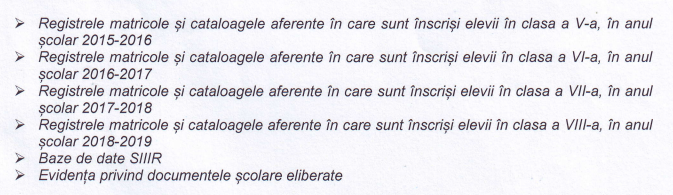 Tot directorilor de școli le revine și sarcina de a completa un tabel în care să figureze elevii care au început clasa a V-a în anul școlar 2015 – 2016, și care din diferite motive nu au terminat clasa a VIII-a în aceeași școală și motivul pentru care nu au fost continuate studiile.