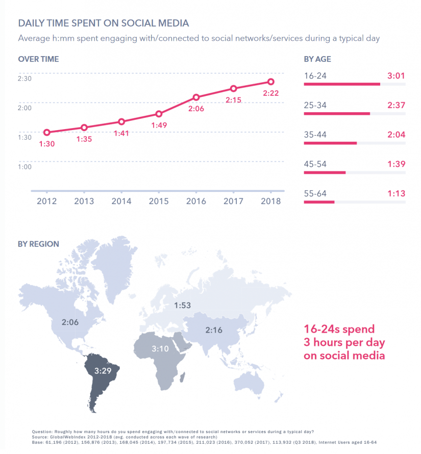 Potrivit unui raport al globalwebindex.com, internauții petrec pe rețelele de socializare la nivel global în medie 2 ore și 22 de minute pe zi.