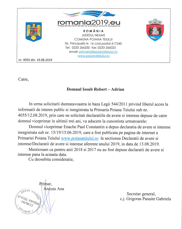 Cum e posibil să nu depui declarațiile de avere și secretarul comunei care se ocupă de legalitatea actelor să se facă că nu vede, e o întrebare pe care ar trebui să o pună cei de la ANI și de la Prefectura Neamț .