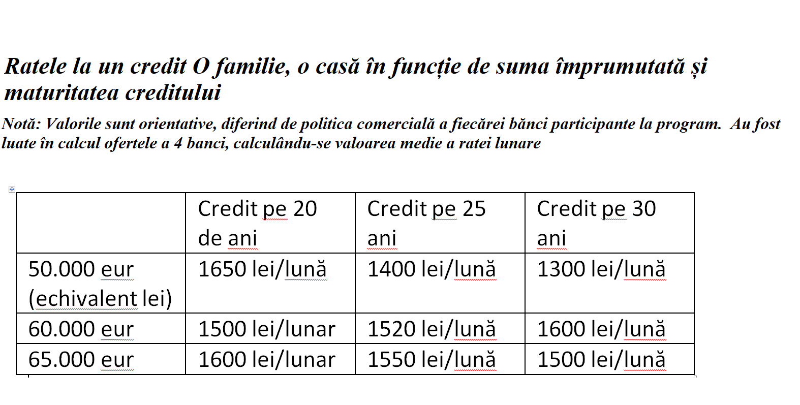 Un român care va dori să își cumpere un apartament prin programul guvernamental ”O Familie, O Casă” se va putea încadra la o rată maximă de 1800 de lei (la un venit de 4500 de lei și un grad de 40%, creditul fiind pe 30 de ani), ceea ce îi va permite achiziția unei proprietăți de circa 300.000 de lei (63.500 euro), potrivit calculelor HotNews.ro. În acest moment, dobânzile anuale efective ale băncilor comerciale la împrumuturile Prima Casă variază între 4.92% și 4.97%, instituțiile de credit având însă și produse dedicate, altele decât cele standard din programul guvernamental.