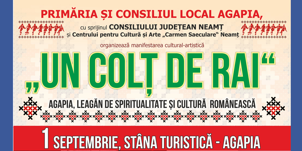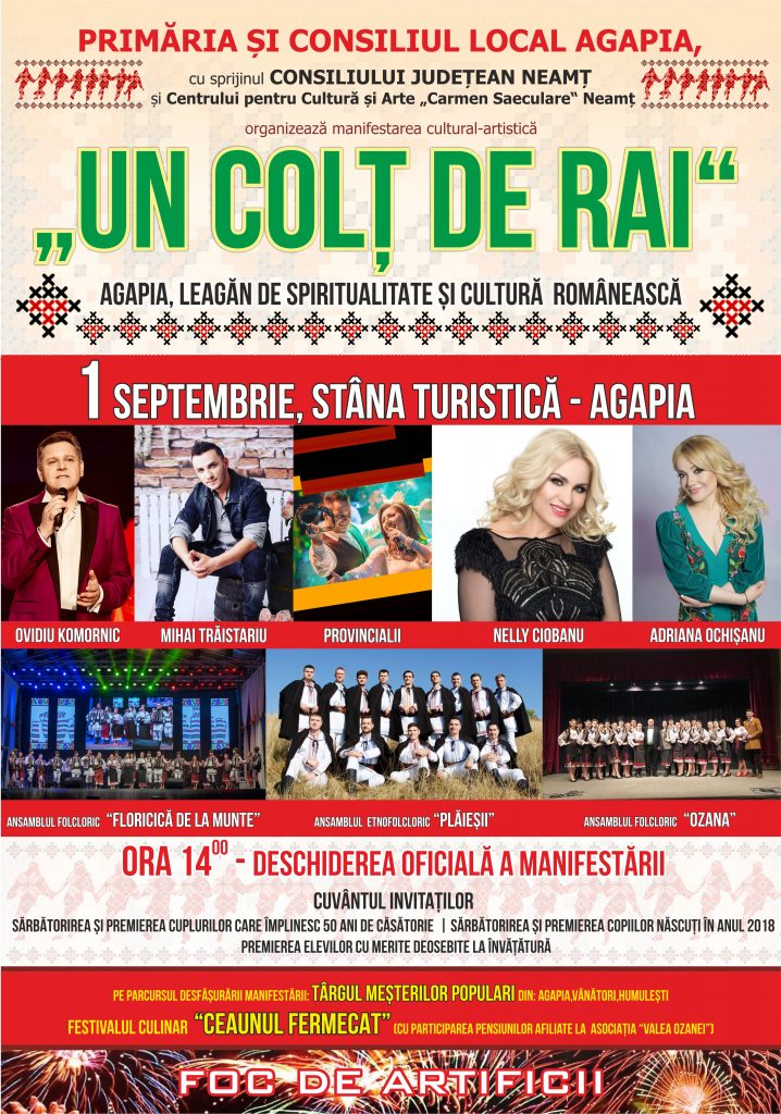 Primăria și Consiliul Local Agapia organizează, cu sprijinul Consiliului Județean Neamț și al Centrului pentru Cultură și Arte Caermen Saeculare, manifestarea cultural-artistică „Un colț de rai: Agapia -leagăn de spiritualitate și cultură românească„.