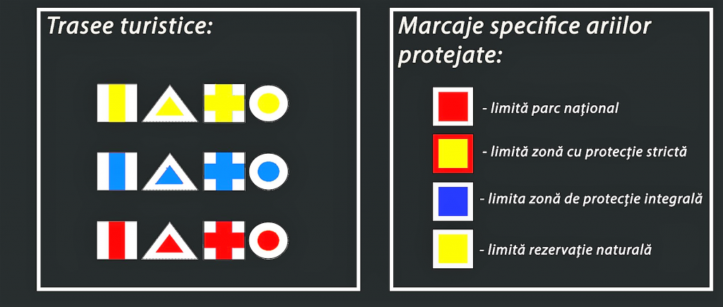Vă prezentăm, mai jos, un vizual cu marcajele specifice ariilor naturale protejate. Este important de menționat că acestea sunt diferite de marcajele specifice traseelor turistice.